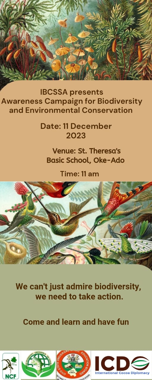 January 24, 2024 Awareness Campaign for Biodiversity and Environmental Conservation at Theresa’s Basic School Oke Ado, Ibadan Start time December 11, 2023 11:00