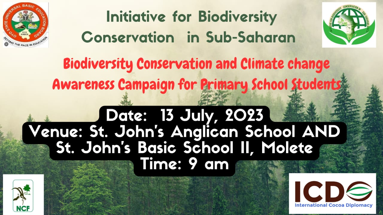 July 20, 2023 Biodiversity Conservation and Climate Change Awareness Campaign at St. John’s Anglican School and St. John Basic School II, Molete, Ibadan Start time July 13, 2023 09:00 Address Molete, Ibadan